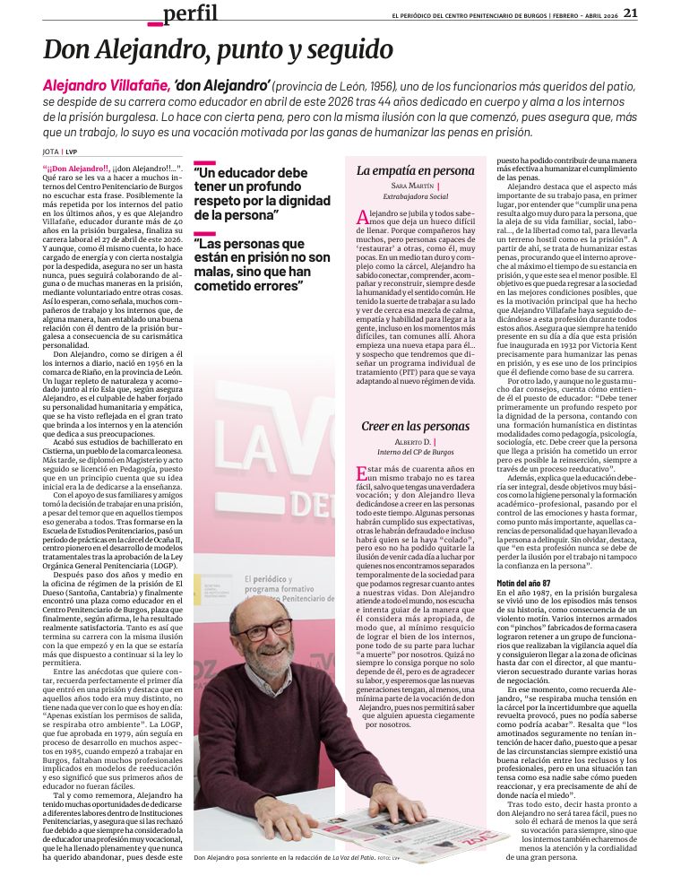 Don Alejandro. Un día recibí una llamada de un señor que decía que a ver cómo se podría articular algo relacionado con el ajedrez en el centro penitenciario de Burgos. Sí a todo fue mi respuesta. Una llamada que no duró más de 3 minutos pero que ya lleva 5 años en marcha. Desde entonces Don Alejandro ha demostrado un compromiso personal con su trabajo que ya lo quisiéramos ver en cualquiera. Con su trabajo en general y con Piensa en Frío en particular, él ha sido durante todo este tiempo el guía del proyecto, quien ha estado siempre al tanto de sacar adelante las ideas en las mejores condiciones posibles: entradas y salidas, difusión y relaciones, y quien ha sacrificado tiempo personal para ello. Se podría decir, que fue quien nos abrió las puertas de la prisión. Hoy por hoy la valoración de Piensa en Frío es positiva para todos los implicados: internos, dirección, Fundación Círculo Burgos, Ayuntamiento, él mismo… Y la mismísima Caissa le debe un agradecimiento, porque ha dado la oportunidad de demostrar que el ajedrez es un elemento absolutamente positivo y adecuado a la perfección en el entorno de centro penitenciarios. Gracias.